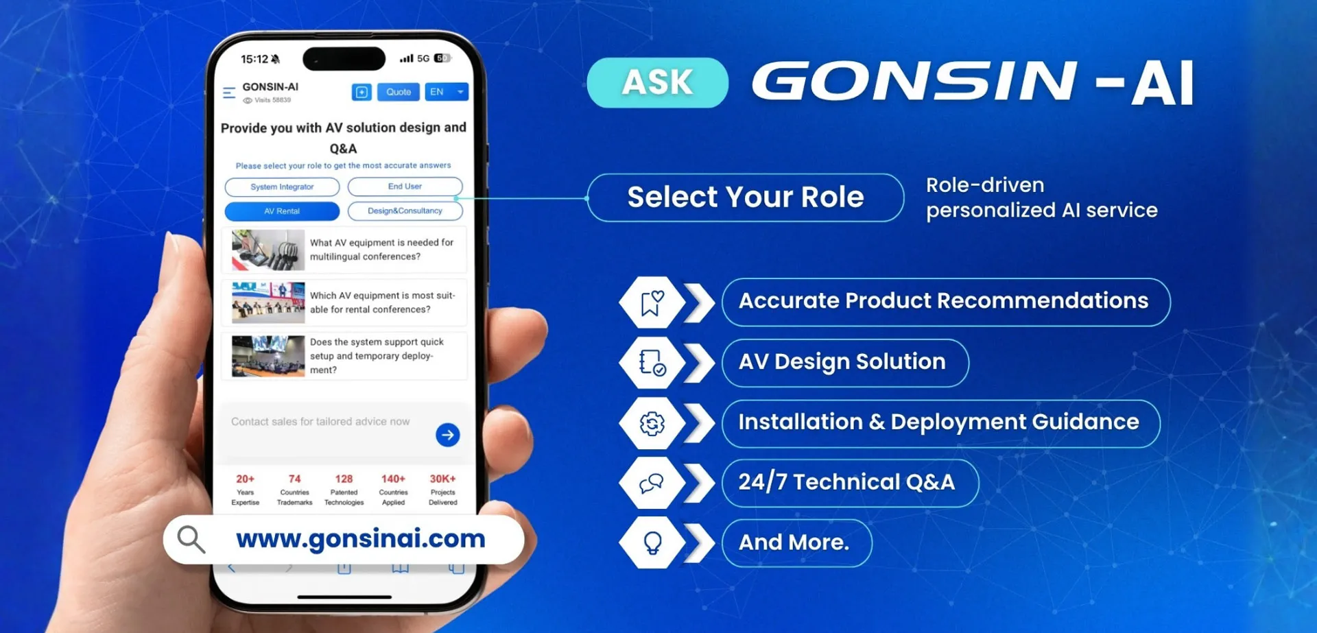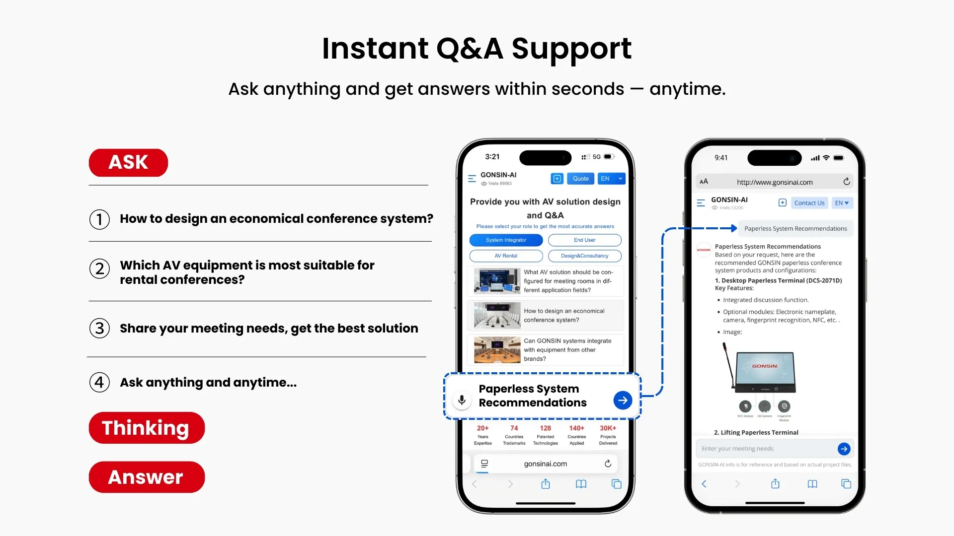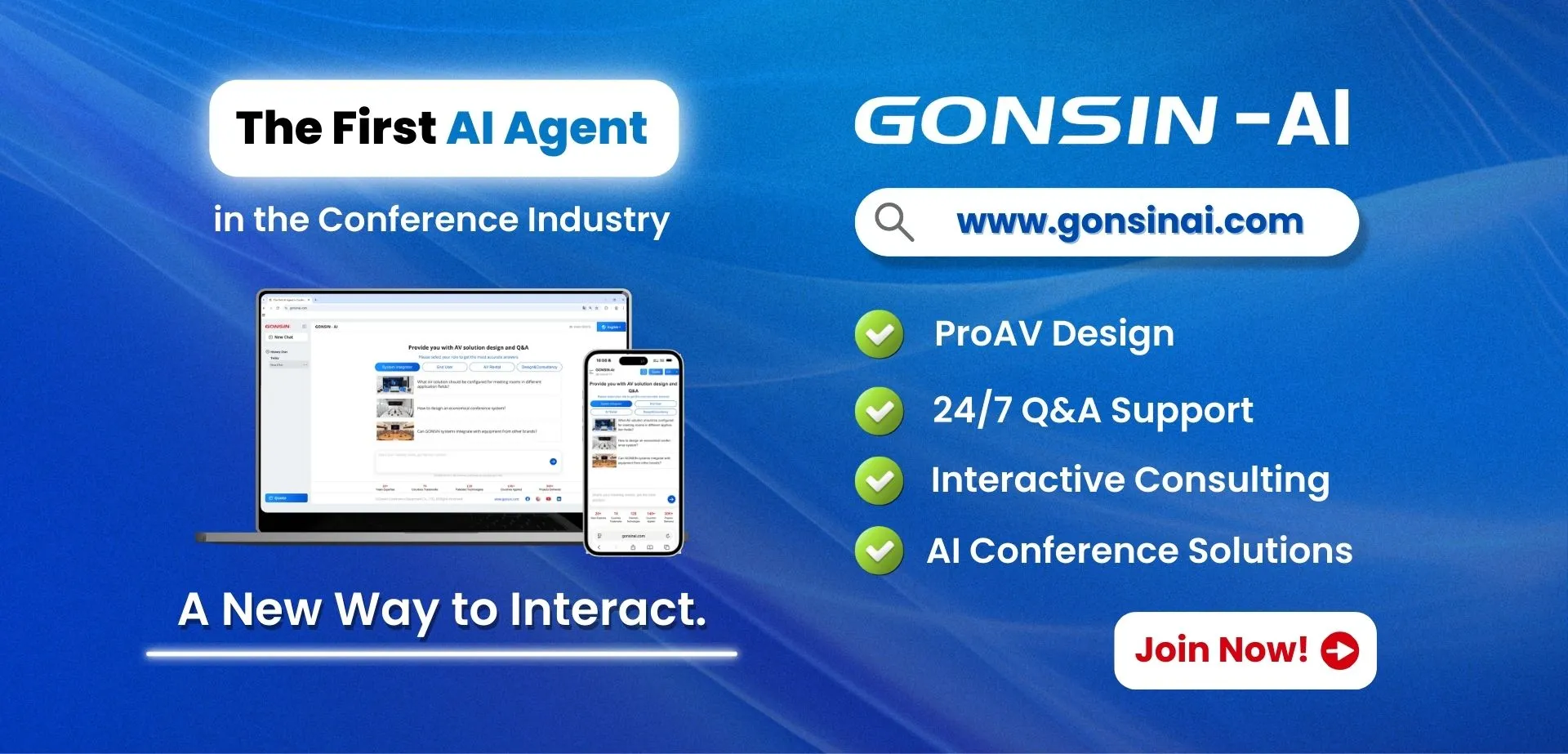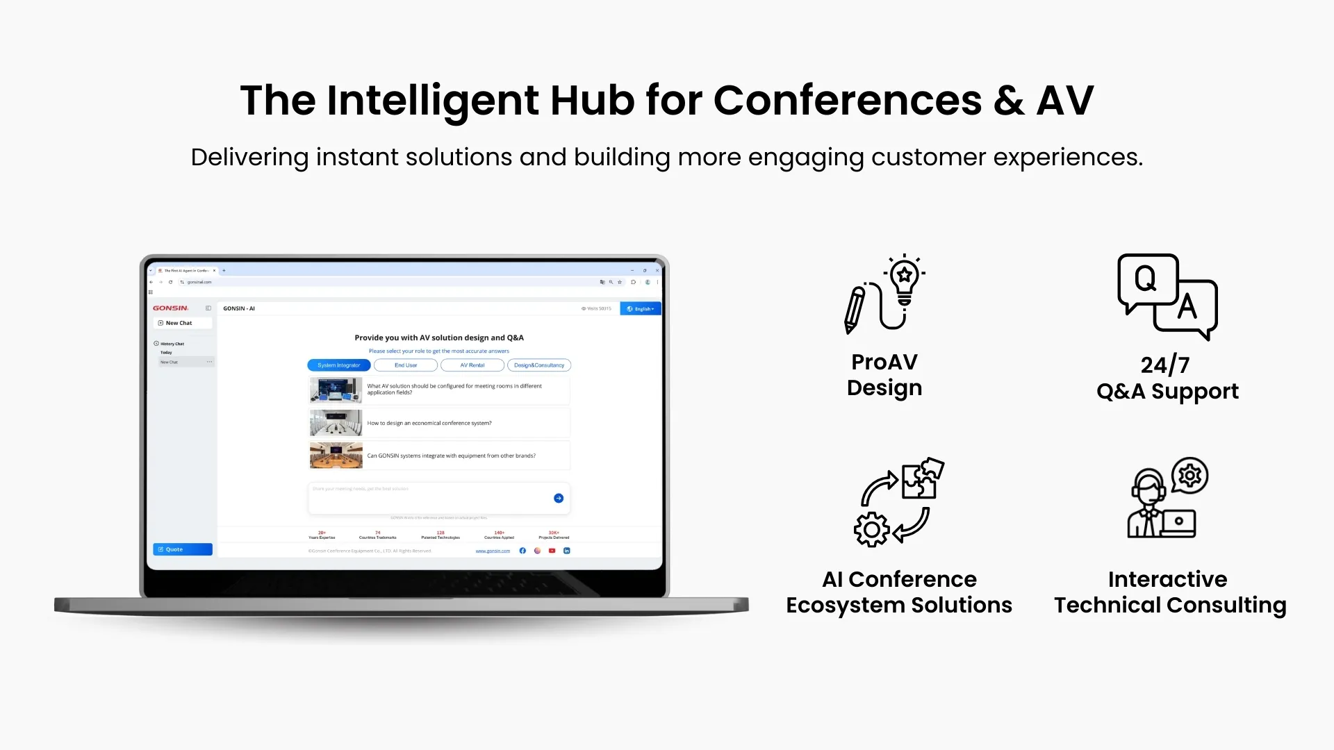 GONSIN-AI, the first AI agent in conferencing, provides ProAV design, real-time Q&A, and interactive technical consulting to solve challenges instantly and build truly engaging customer experiences.